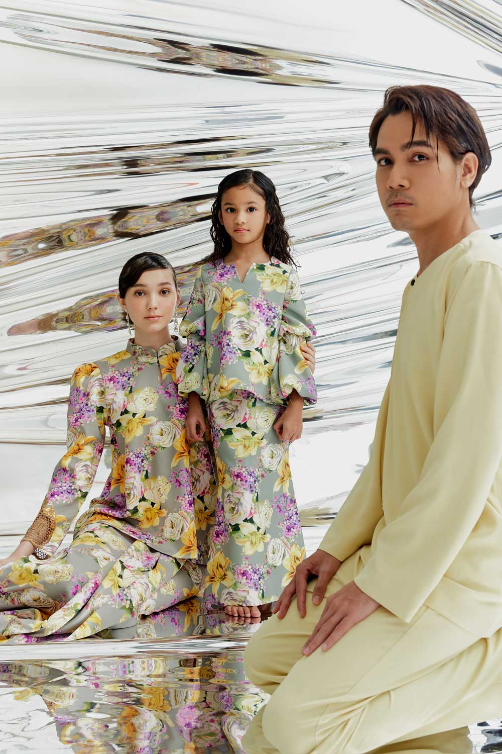 Adina Kids is a floral kurung kedah with two tier puffy sleeves and mermaid skirt