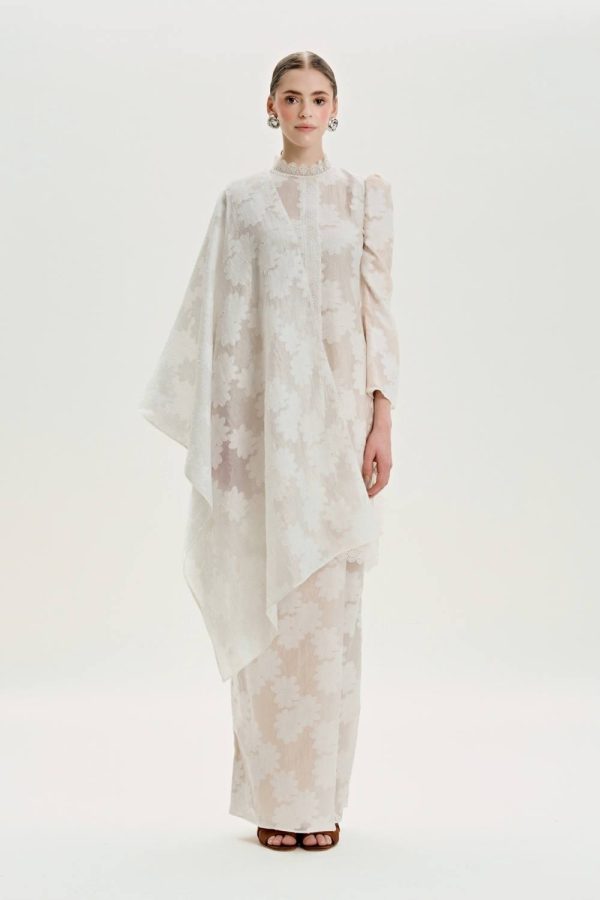 Beatrice is a monochromatic kurung pahang with lace trim detailing and a decorative border lace on the bodice and the neckline. Beatrice also comes in kids size.