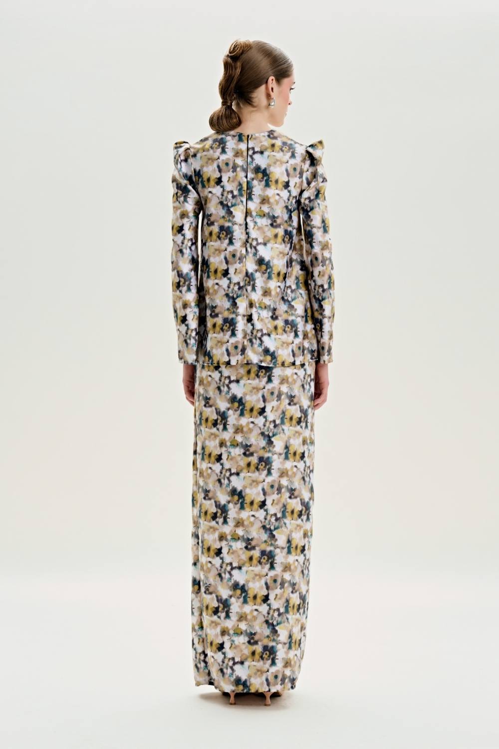 Kayali is a satin kurung kedah with tulle neckline detailing and a frontal pleated skirt.