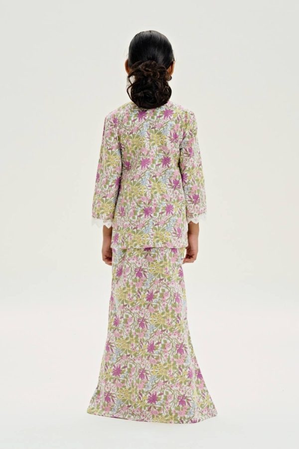 Renata kids is a cotton floral kurung kedah with trendy lacey sleeves with bow detailing. Renata also available in adult size.
