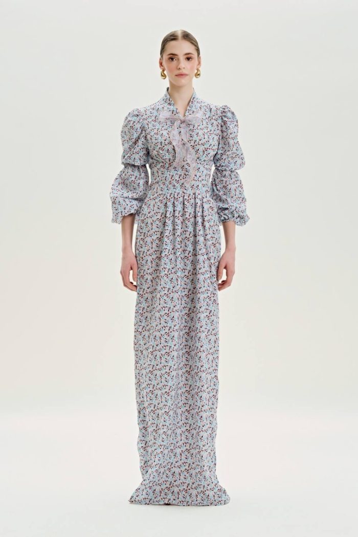 Details: Soft A-line maxi dress V-neck collar with organza ribbon detailing Puffy sleeves with elastic pleated waist Back zipper with side slit Material: Cotton Color: Light blue Caring instruction: Handwash/machine wash on cold only. Do not tumble dry as wet cotton material may be shrinking with heat.