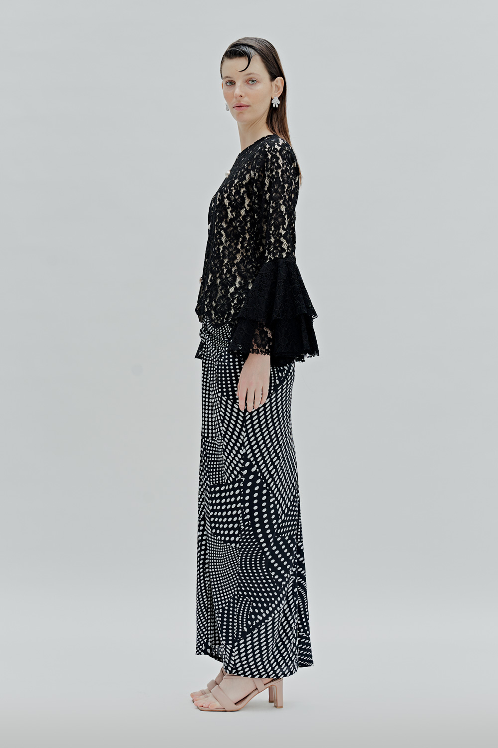 Zamara is a signature Petra kurung kedah decked with french lace and bow detailing. Details: Loose fit kurung kedah with back box pleat French lace and bow sleeve detailing Scallop neckline Back zipper Straight cut skirt with zip and hook fastening Material: polycrepe Color: black and white